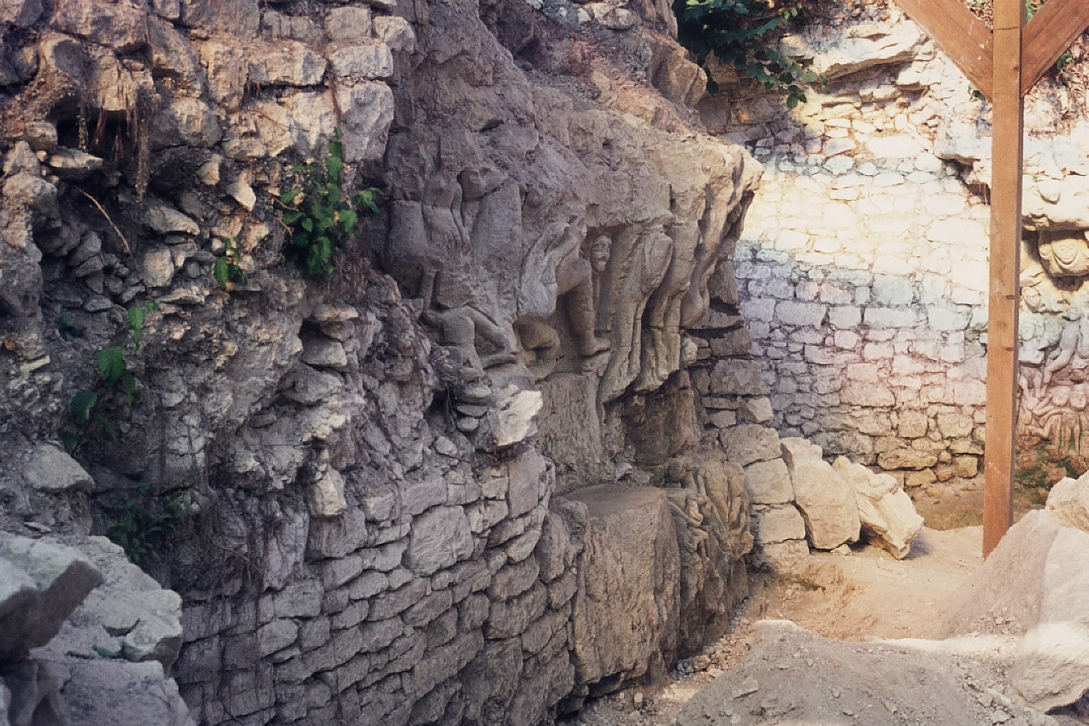 panneaux F et D en cours de dégagement partiellement pris dans des murs en petit appareil - F171 sans tête -