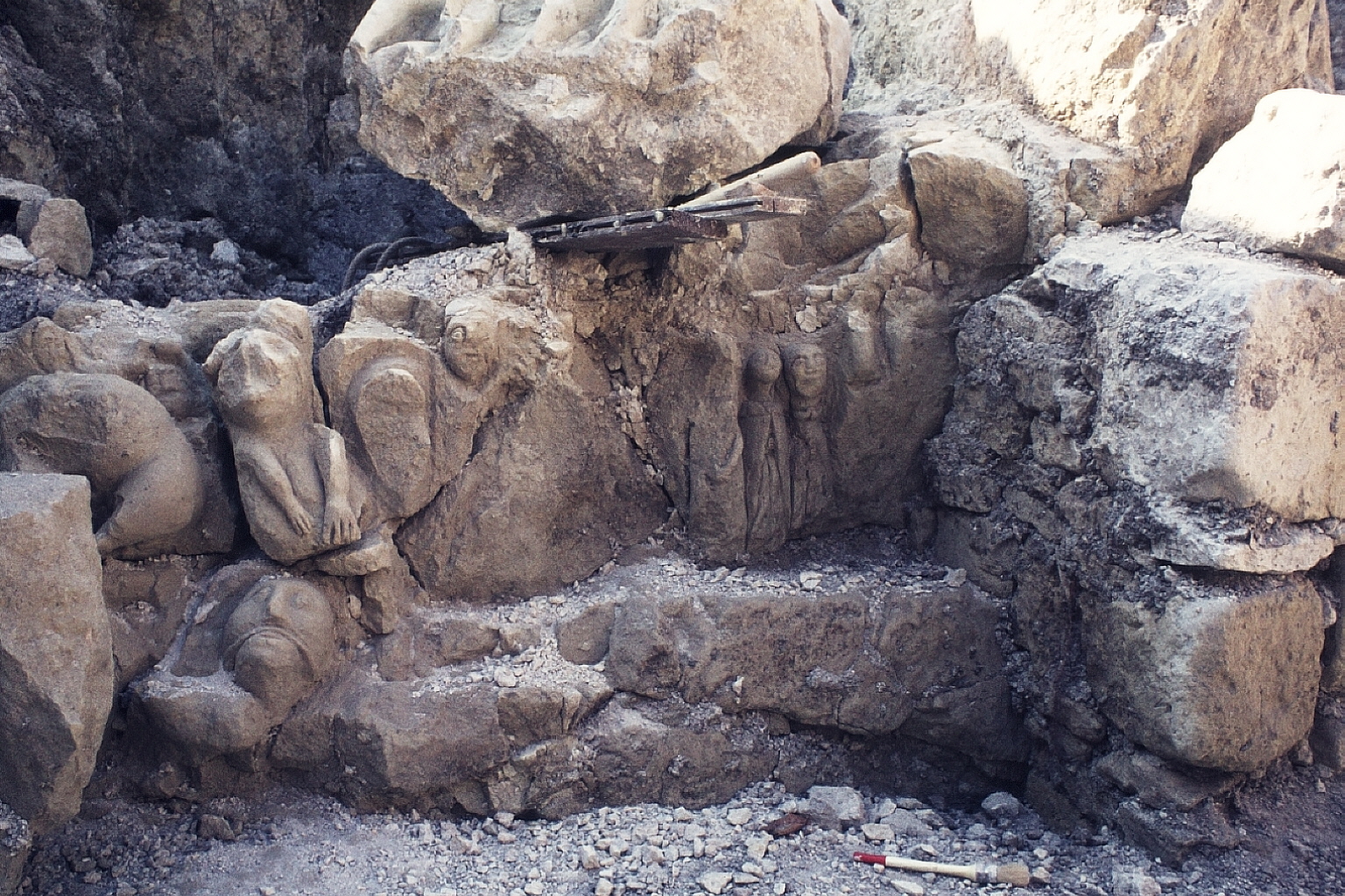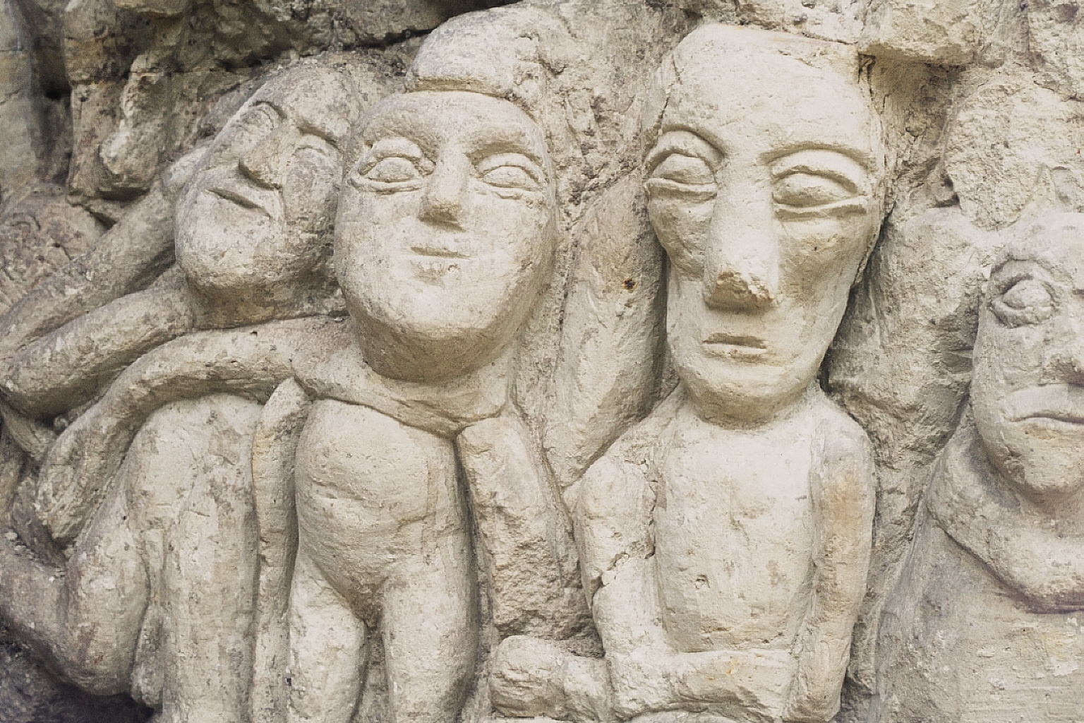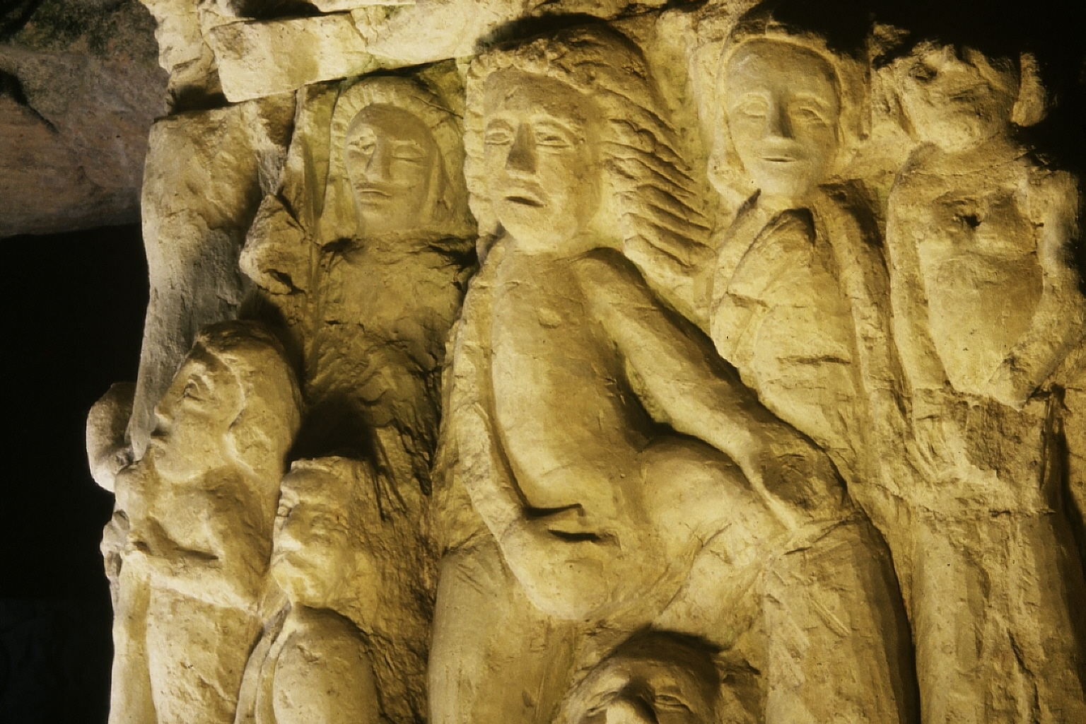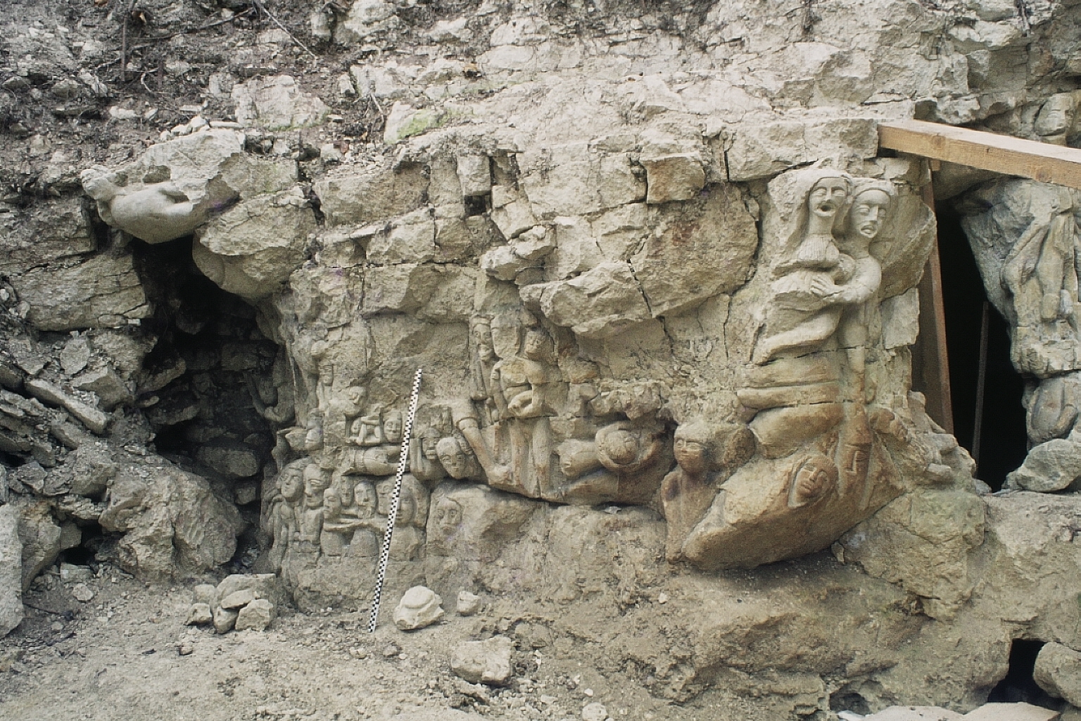 plusieurs personnages sculptés sur un poteau. C'est la partie droite de E