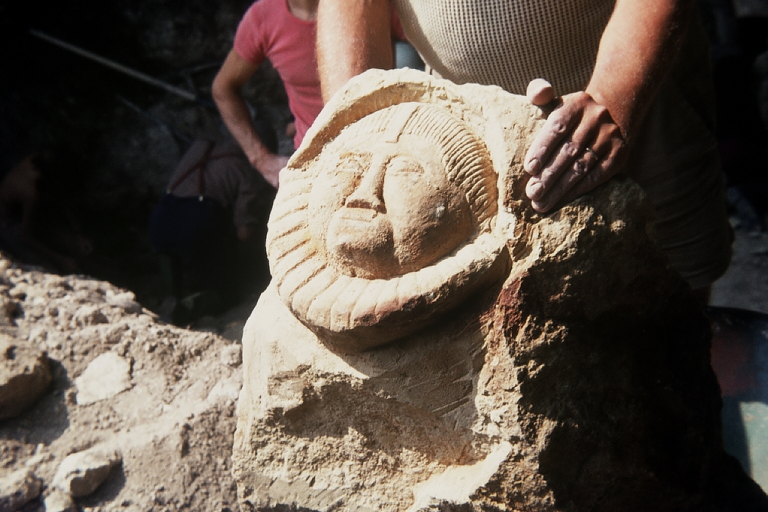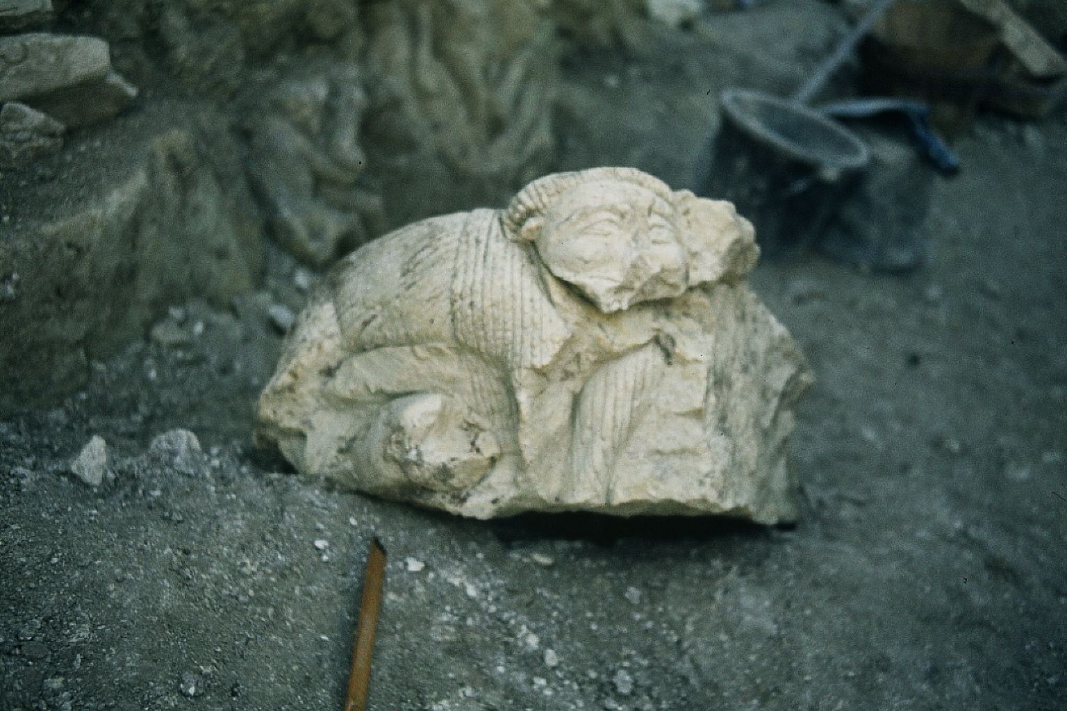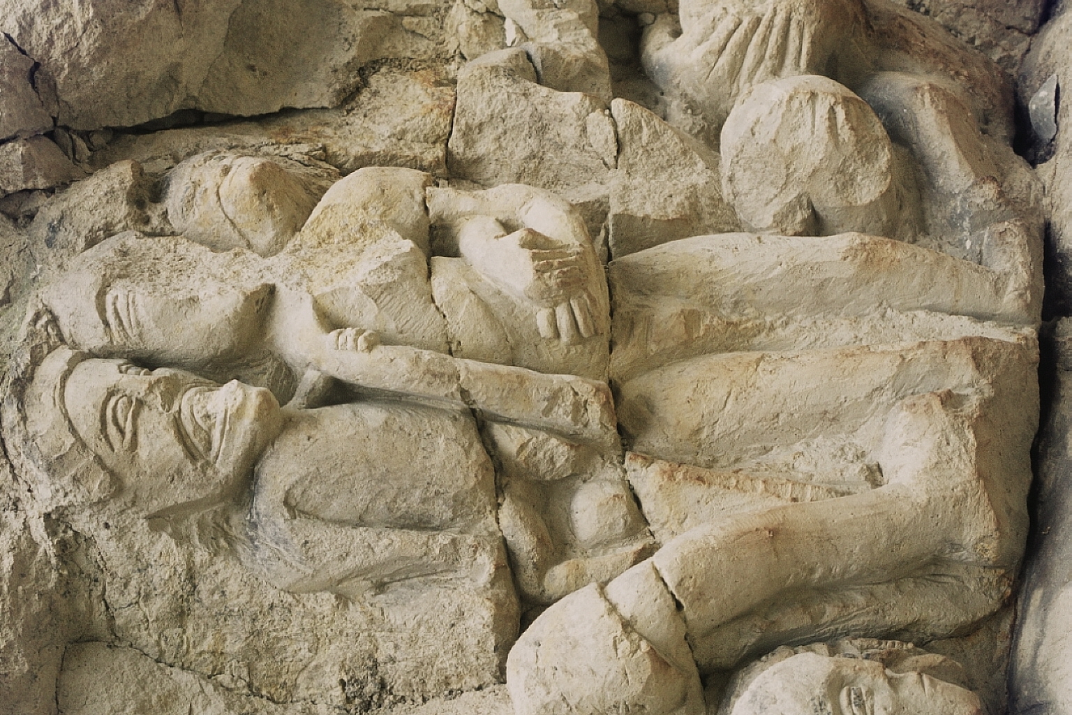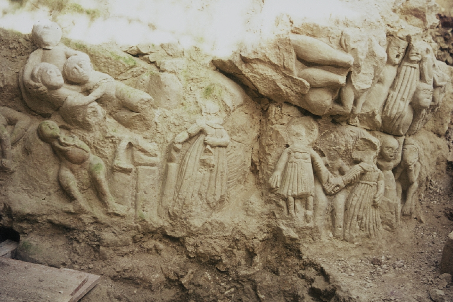 plusieurs personnages sculptés sur un poteau. C'est la partie droite de E