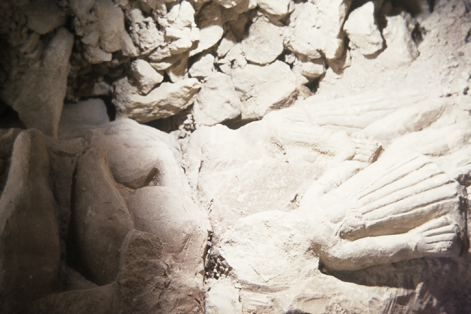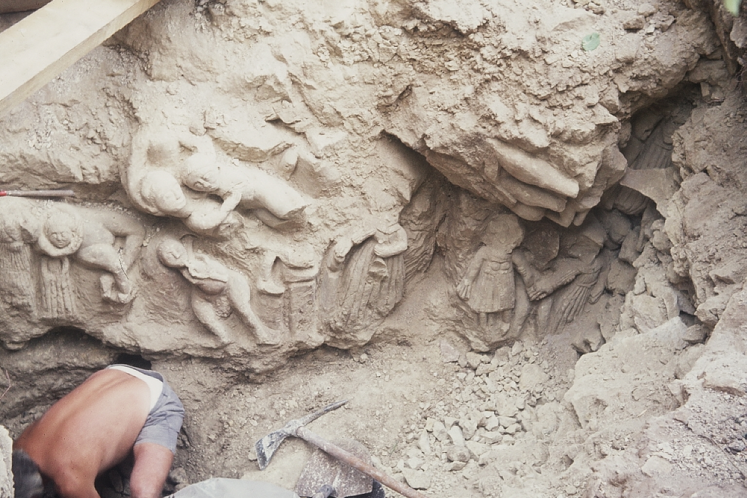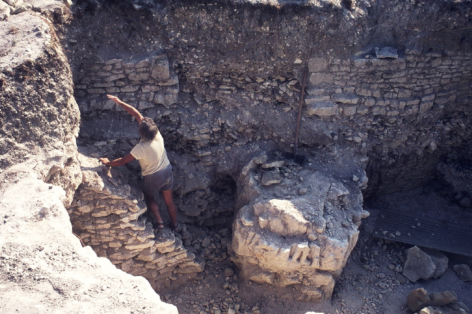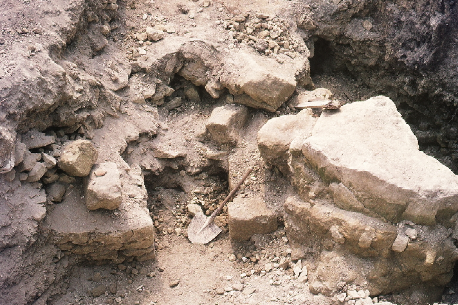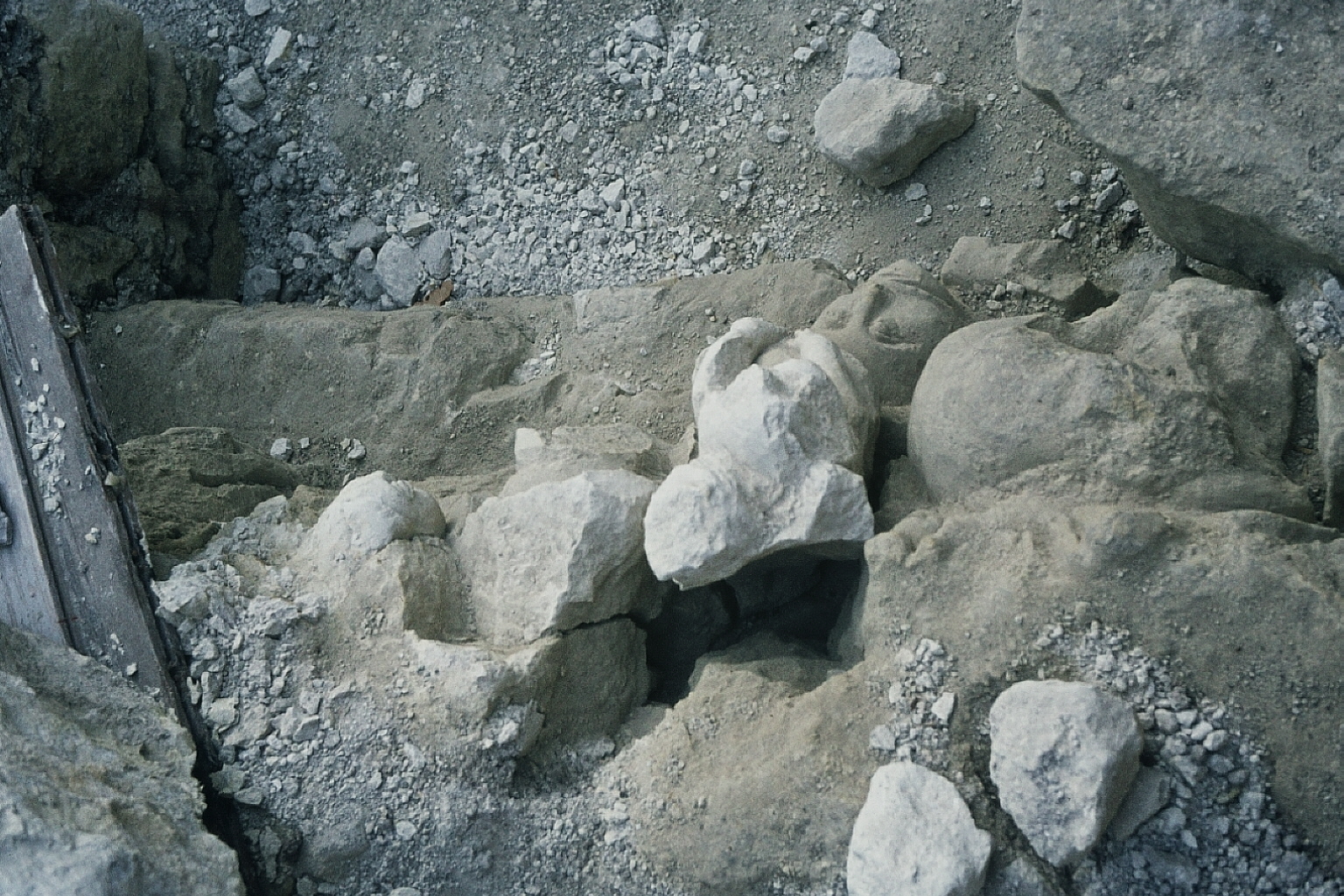 fouilles murets - plusieurs murets et un pilier (?) avec des parties inférieures de statues