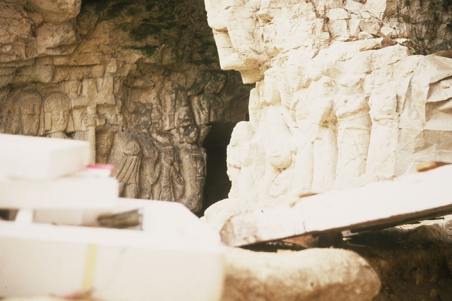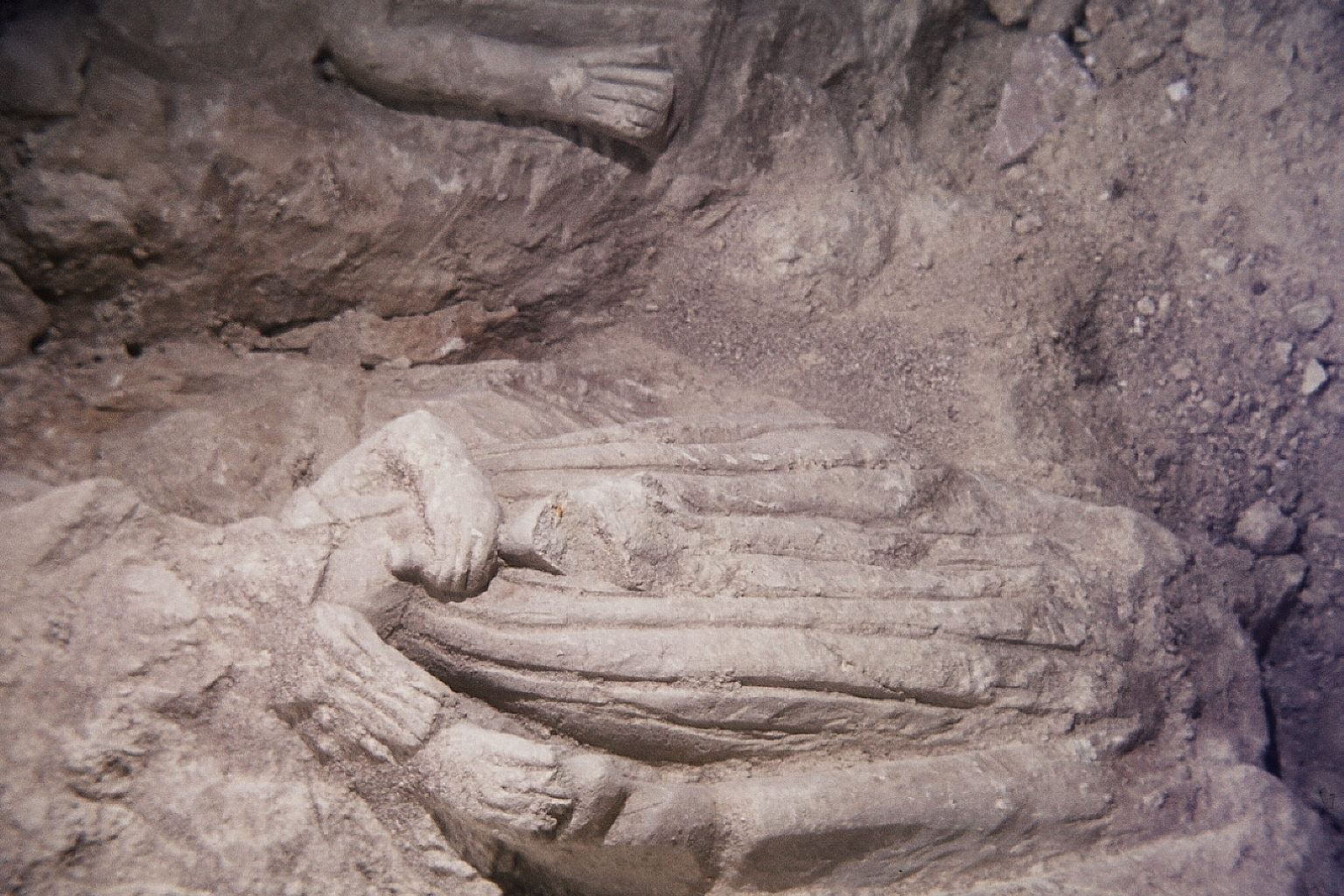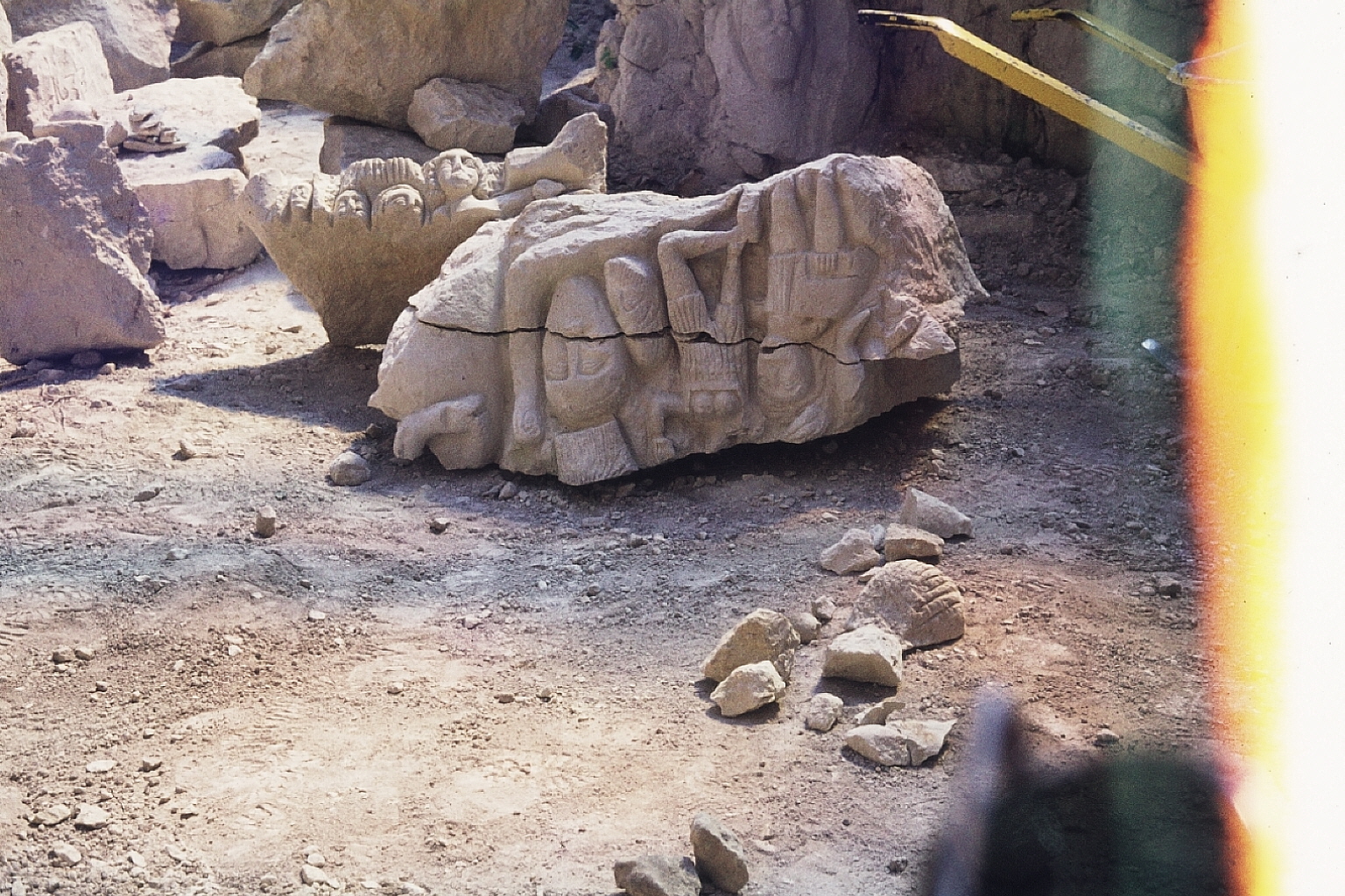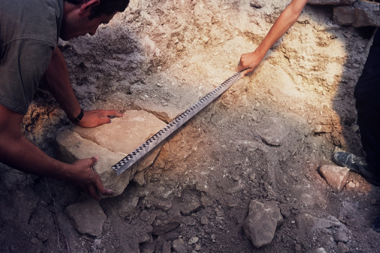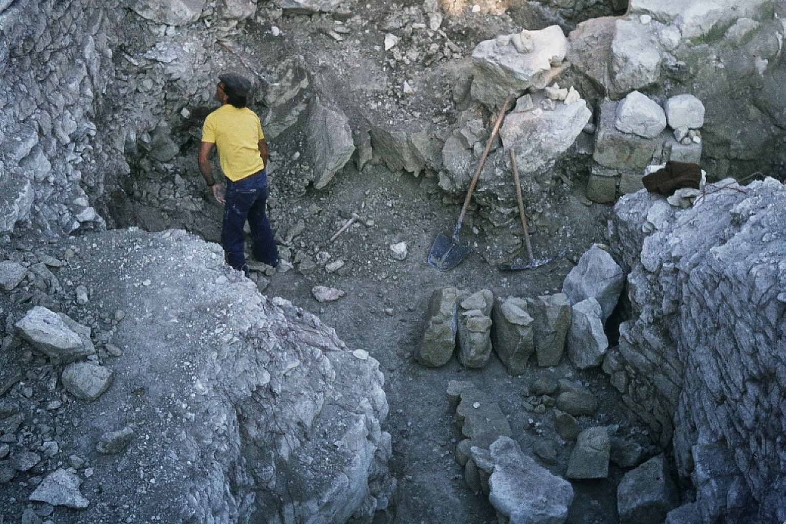 fouilles murets - plusieurs murets et un pilier (?) avec des parties inférieures de statues