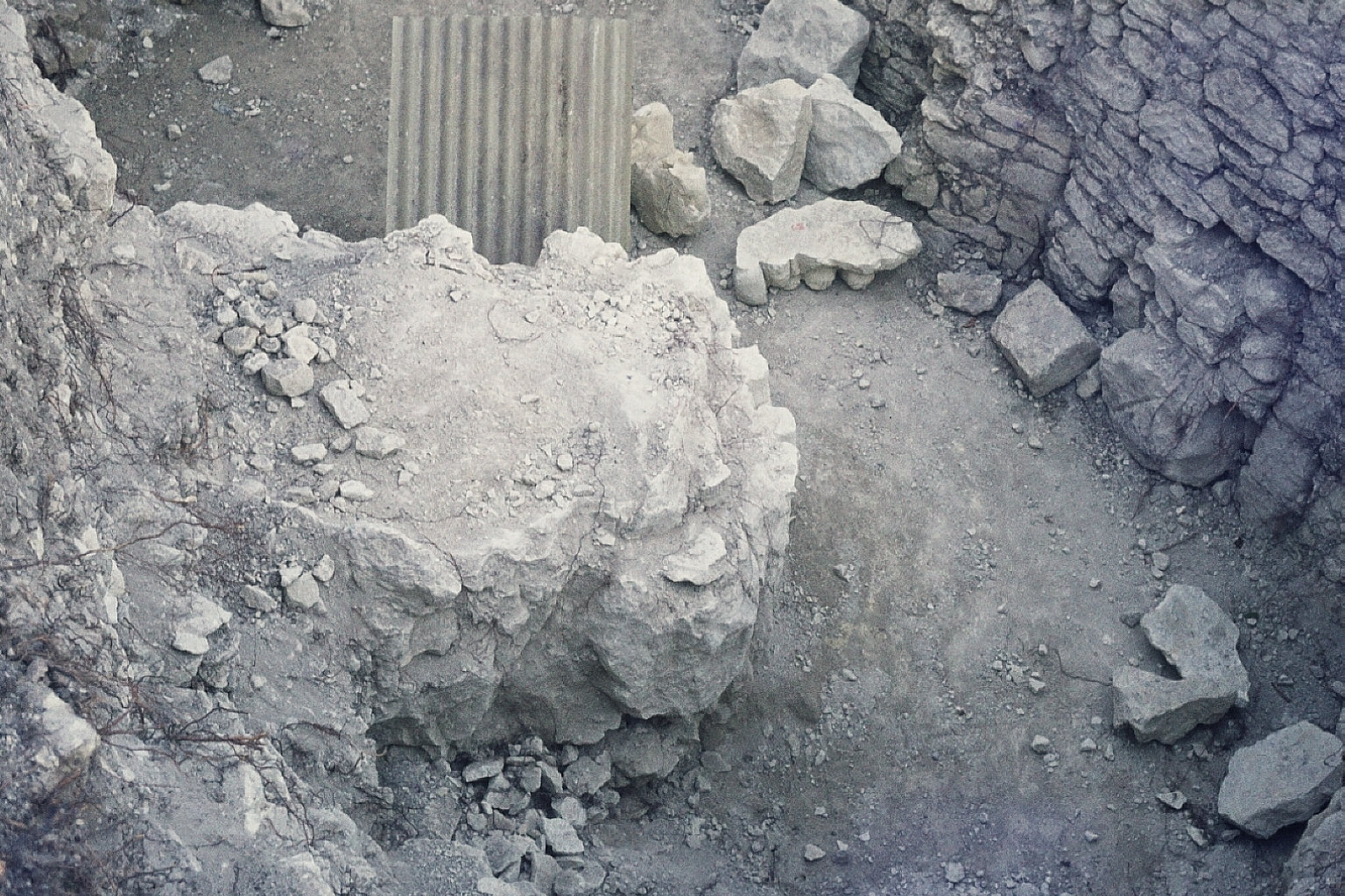 une partie du panneau I posée à l'envers au milieu de la cour