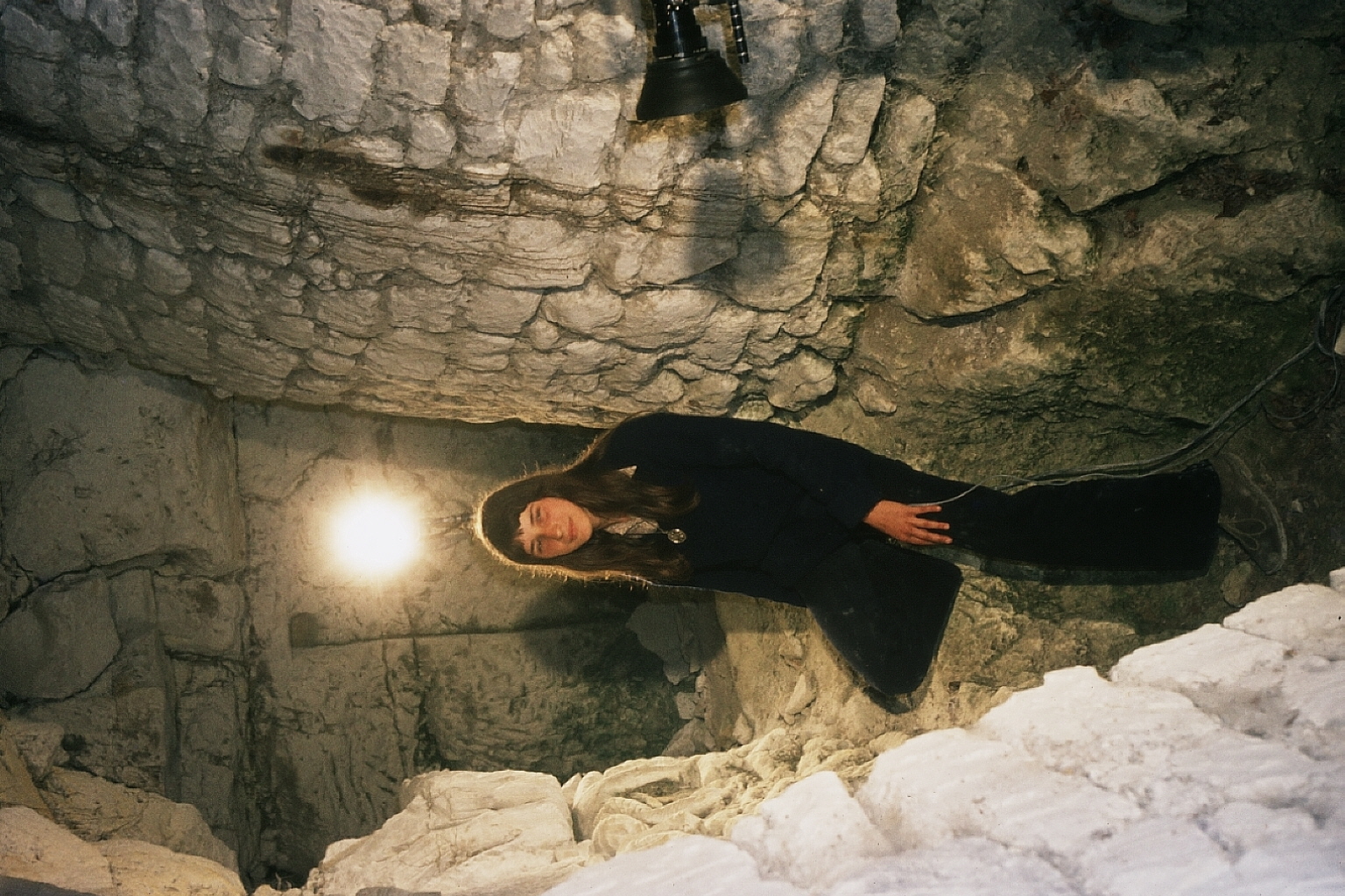 dans la cave - une figurante & un cameraman devant un panneau non identifié (E)