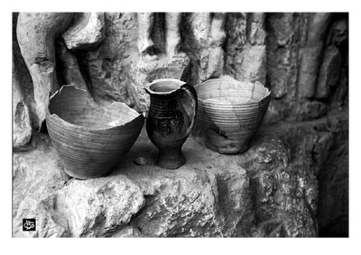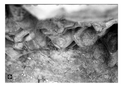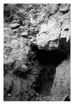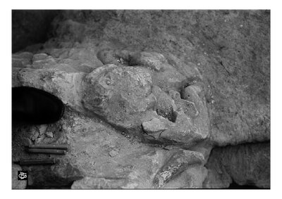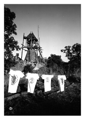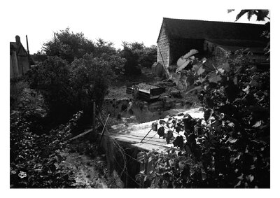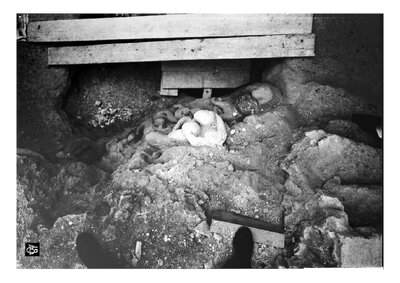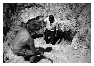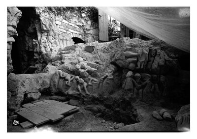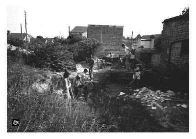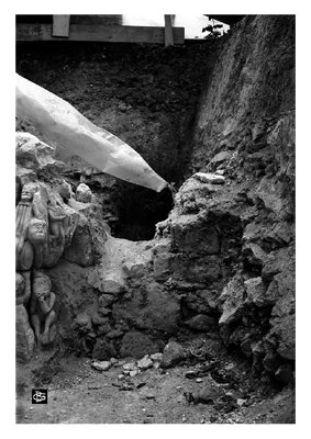 fouille en cours sur le parking - au fond à gauche, la chapelle à droite la maison du patrimoine et le puits - cave couverte par une tole ondulée (ou du plexiglas ?)