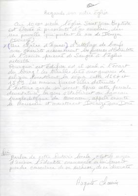 texte manuscrit non daté écrit par Auguste Chauvin - "regards sur notre église" - les pierres de l'église Saint jean-Baptiste de Dénezé ont été récupérées de "l'ancien prieuré de Saugré" et acheminées…