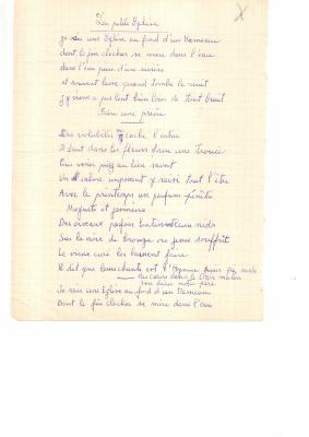 poême manuscrit intitulé "la petite église" signé "Rolande Agabert 36000 Chateauroux"