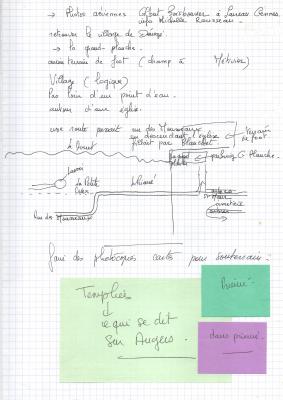 document manuscrit non daté avec un plan - auteru probable E. Lefort. Noms cités : - Gilbert Boisbouvier - Michelle Rousseau - la grand-planche - Métivier - rue des mousseaux - prieuré - la petite cro…