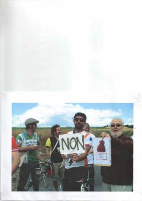 photo de manifestant avec affiche "NON"; certains à vélo + Jean-françois Agobert - mention "2015 ?"