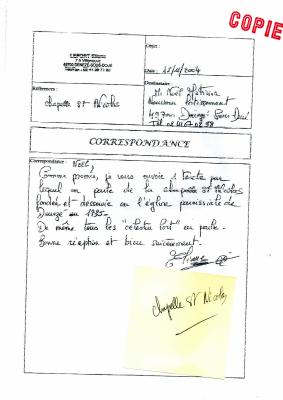fax à Noël Métivier de la transcription du texte de 1735 doc CL Mousseaux 2-185 + notes manuscrites "1 croix-tient quelque chose - Abraham -Robert Thomas - Charles de Charvière écuyer …. De Nueil mais…