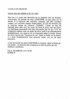 CR de visite chez A. Héron le 04/10/1999. utilisation d'un "escalier pour aller vers les caves du fond et aussi vers les fours". "En 1774, les sculptures étaient sous un amas de terre suite à un effon…