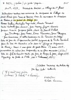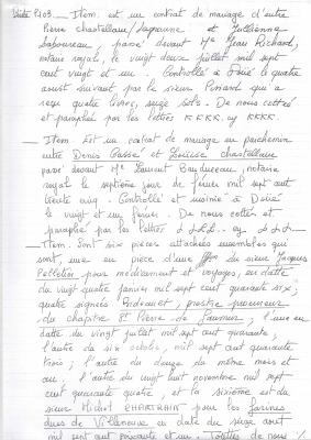 Copie manuscrite par E. Lefort d'une partie d'un inventaire de documents notariés - commence en haut à gauche par "suite page 103" - 1721 - 1746 - 1743 - 1774- inventaire Chastellain, curé de Dénezé- …