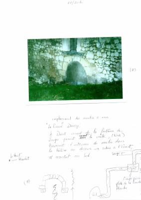 première page commentaires manuscrits emplacement du moulin à eau avec plan fait à la main + photos extérieur et intérieur de l'église - "grande pierre plate de la grande planche".