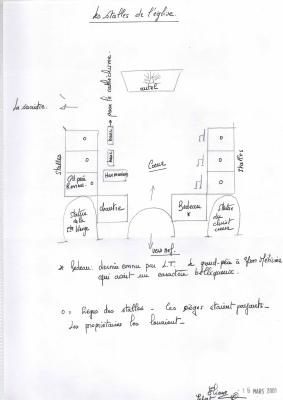 CR partiel rencontre avec Lucien Treuiller le 10/03/2001 -plan de la disposition des différents éléments dans l'église (stalles, bancs, etc …) par E. Lefort daté du 16 mars 2001. (fait référence à la …