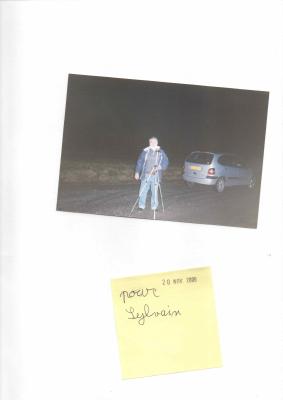 photo couleur prise de nuit d'un individu non identifié devant une voiture gris-bleu avec post-it "pour Sylvain"