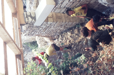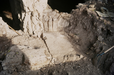 sous le toit en plastique; mur dont le sommet parait neuf avec un linteau d'une seule pièce