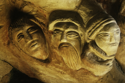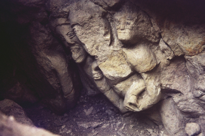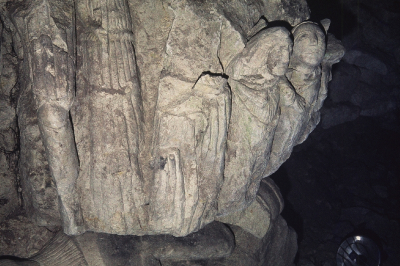 plusieurs personnages sculptés sur un poteau. C'est la partie droite de E
