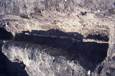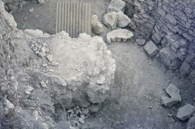 fouilles murets - plusieurs murets et un pilier (?) avec des parties inférieures de statues