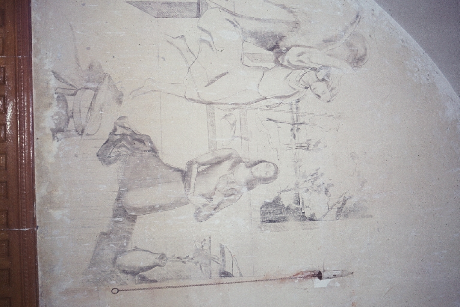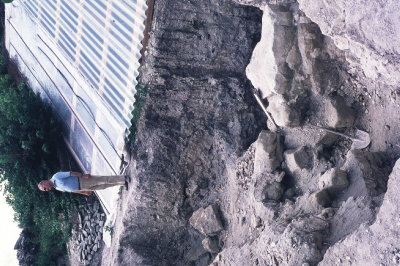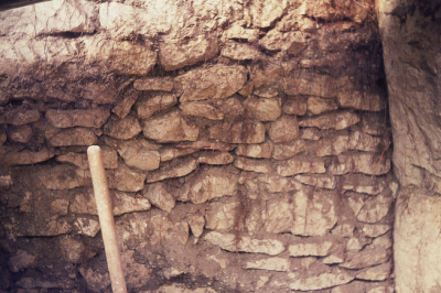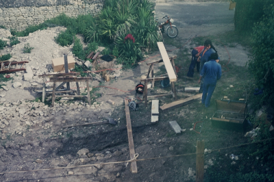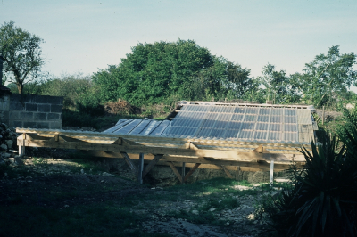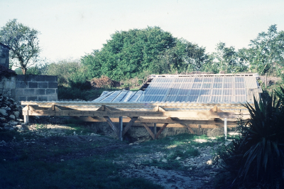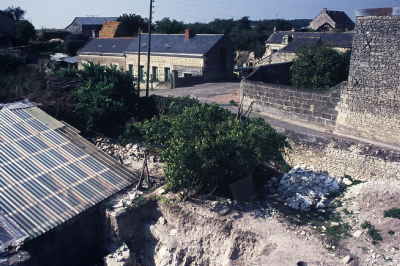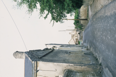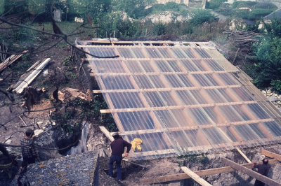 le toit en plastique, la rue, le mur de l'ancien presbytere, le carrefour