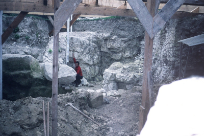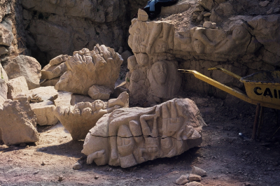 la cour avec une benne et des fouilleurs qui mettent des pierres dedans