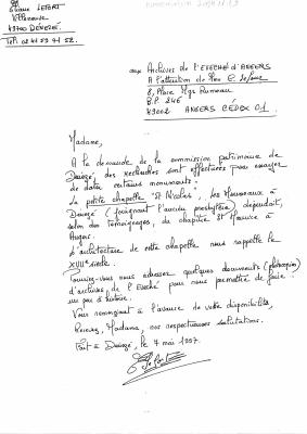 Demande de E. Lefort à l'archevêché d'Angers - cite la chapelle St Nicolas "l'architecture de cette chapelle nous rappelle le VXII° siècle"