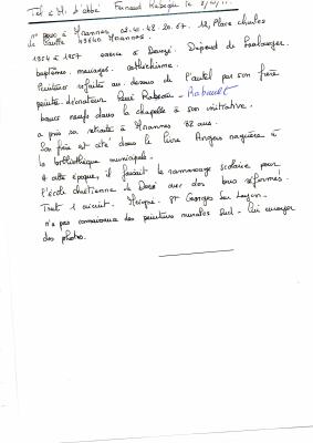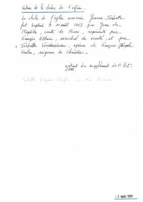 histoire manuscrite de la cloche de l'église copie manuelle de CélestinPort suppélemnt 1989 + Fax de E. Lefort à Auguste Chauvin La Carte à propos bulletin municipal + une photo légendée "Alfred Lefor…