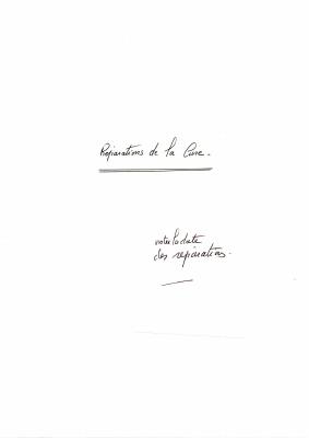 texte manuscrit qui reprend les résumés de Anne Faucou sur las cotes des archives départementales 5E 23/74 du 12/11/1775 : réparation et travaux par le curé Benoist (table d'autel, toiture, mur de la…