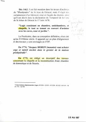 fin d'un texte manuscrit rédigé par E. Lefort sur l'histoire de l'église de St Jean de Dénezé - 1092 Chavais et Saugré - écurie - moulin à eau - histoire de la paroisse et de ses liens avec Chemillé …