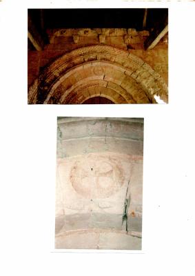 2 photos du porche de l'église Dénezé dont un gros paln de la croix pattée rouge cerclée sur fond blanc -Courrier de André Sornais à E. Lefort à propos origine templière du prieuré et de l'église; il …