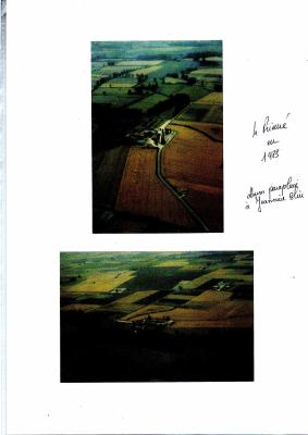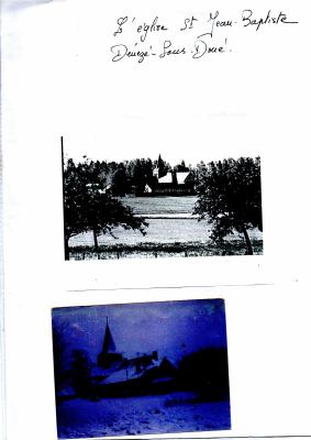 3 photos (2+1) du prieuré dont une sous la neige et une aérienne - première page légendée église Saint Jean Baptiste de Dénezé sous Doué
